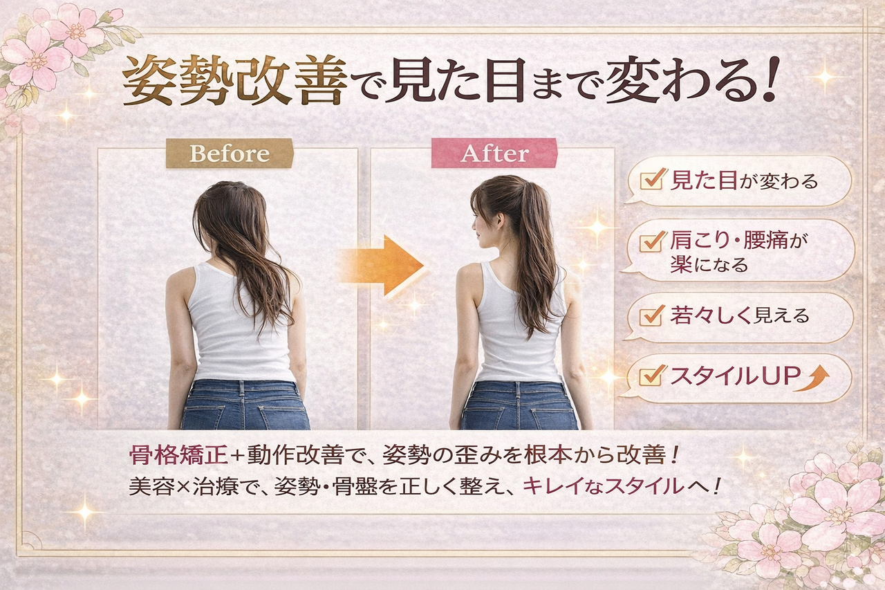 当院では、骨格矯正+動作改善により根本からキレイな姿勢へ導きます。