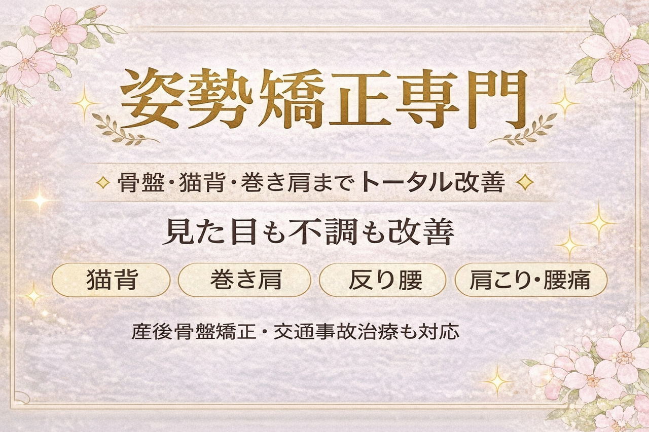 肩こり・腰痛・坐骨神経痛などの慢性的なお悩みから、姿勢矯正・骨盤矯正・産後骨盤矯正まで幅広く対応。
